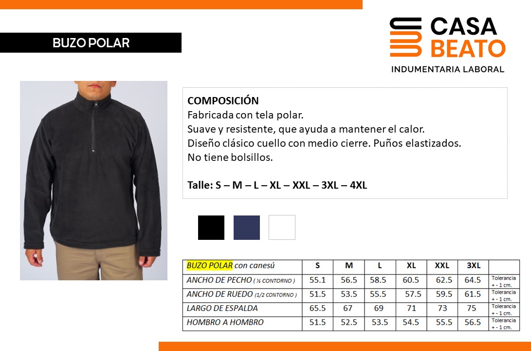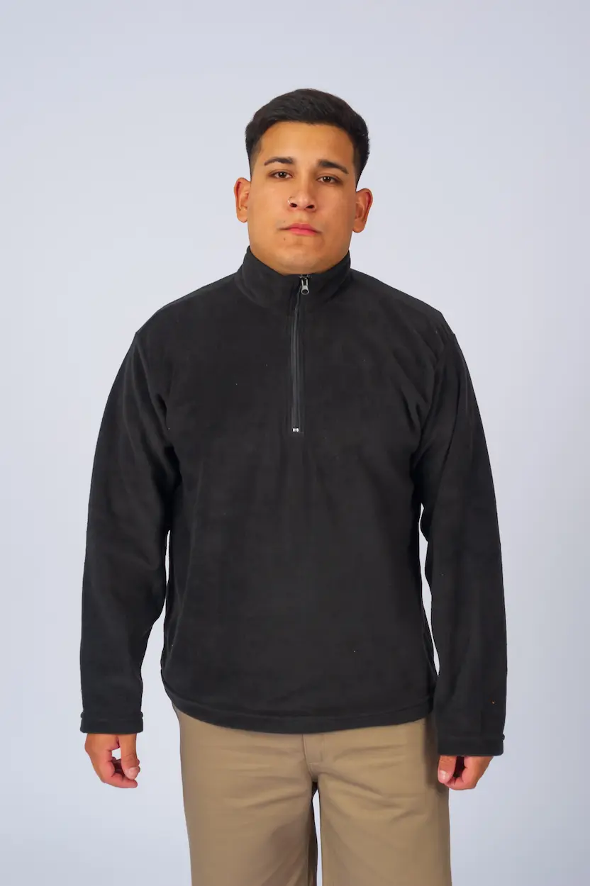 Fabricada con tela polar. Suave y resistente, que ayuda a mantener el calor. Diseño clásico cuello con medio cierre. Puños elastizados. No tiene bolsillos.